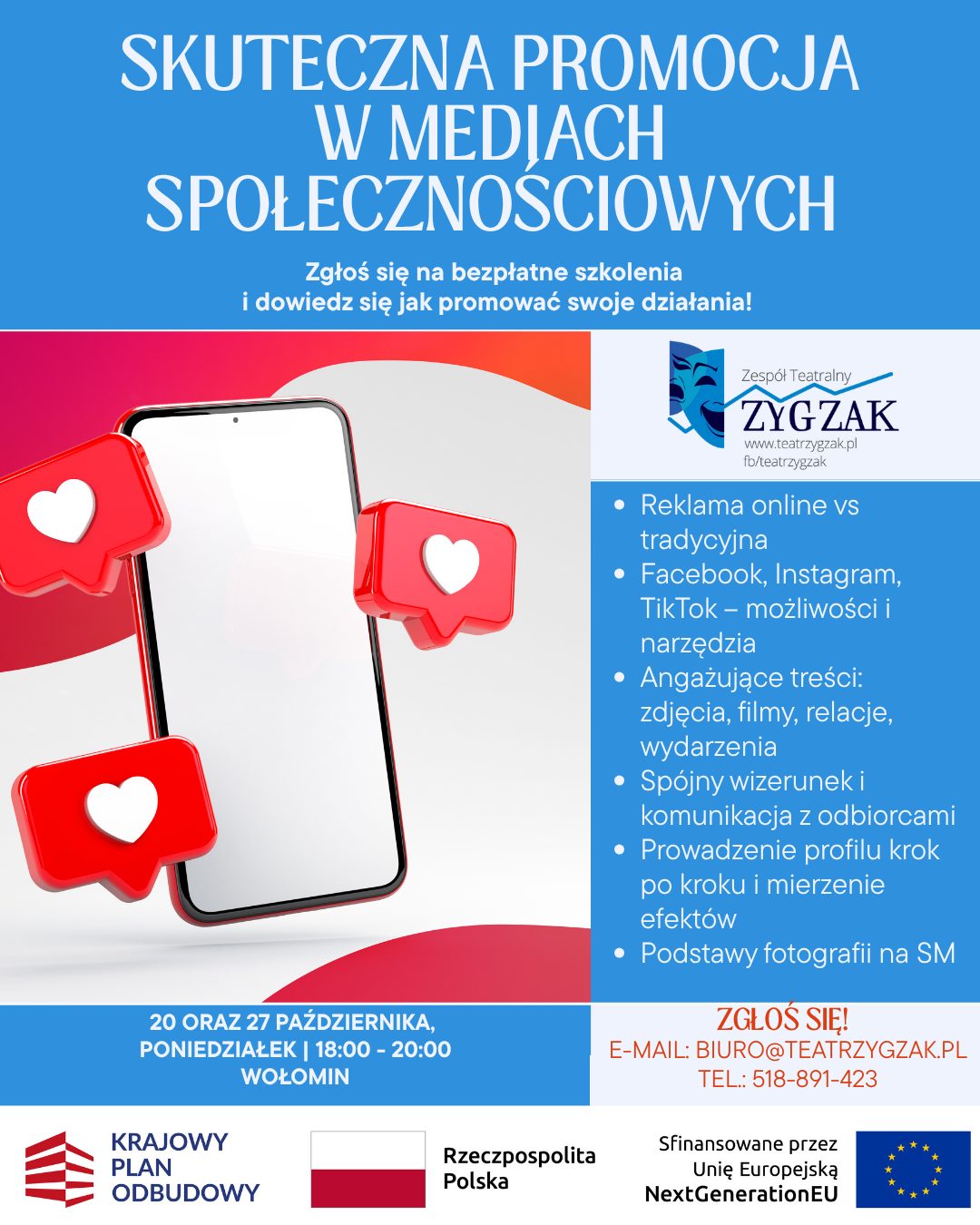 SKUTECZNA PROMOCJA W MEDIACH SPOŁECZNOŚCIOWYCH! Chcesz dowiedzieć się, jak skutecznie promować swoje działania w mediach społecznościowych? Zgłoś się na nasze bezpłatne szkolenia! W programie m.in.: Reklama online vs tradycyjna Facebook, Instagram, TikTok – możliwości i narzędzia Angażujące treści: zdjęcia, filmy, relacje, wydarzenia Spójny wizerunek i komunikacja z odbiorcami Prowadzenie profilu krok po kroku Podstawy Czytaj więcej